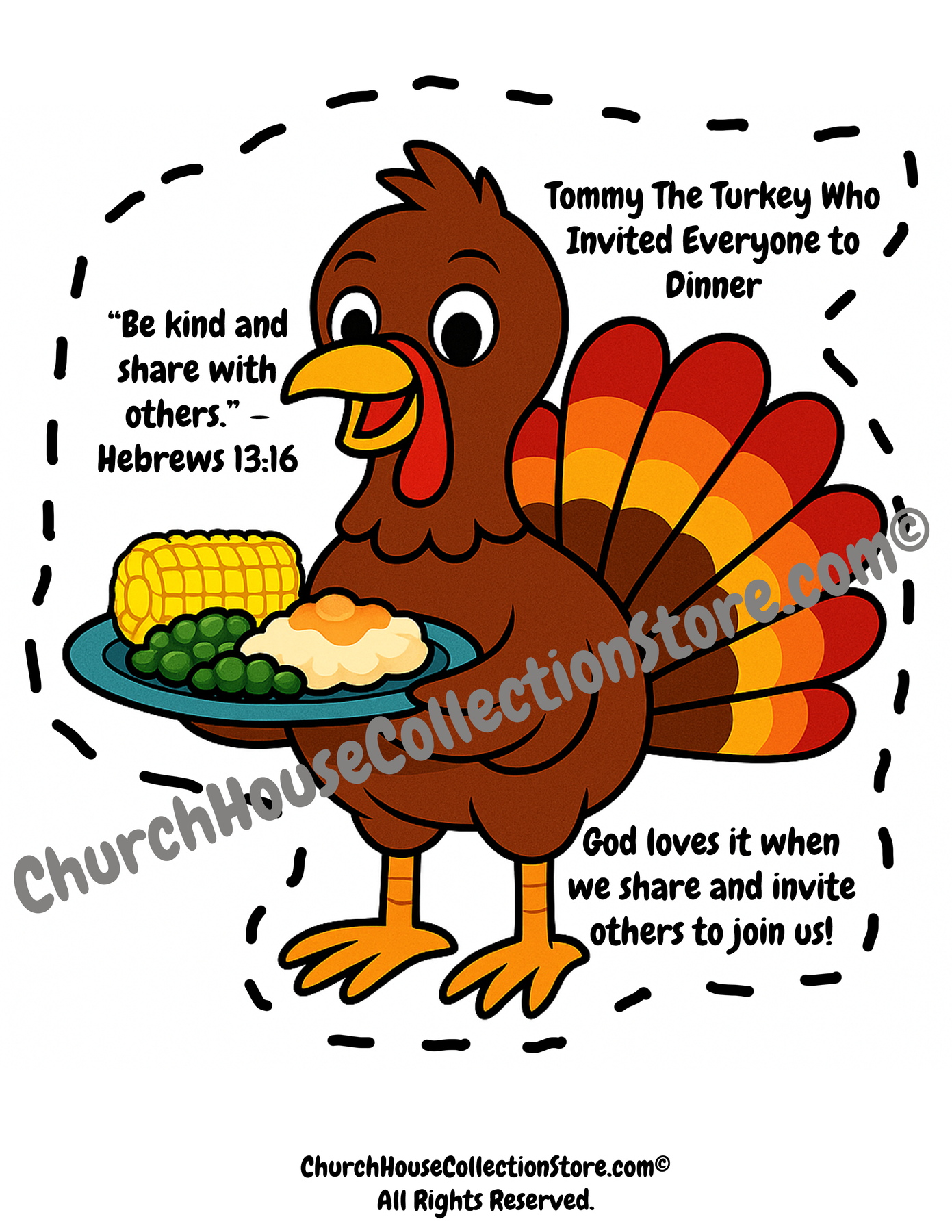 This printable goes with the free Bible preschool lesson “The Turkey Who Invited Everyone to Dinner” from Church House Collection, which includes a matching craft, coloring page, snack idea, song, and poem to help little ones learn that God loves it when we share and invite others in.